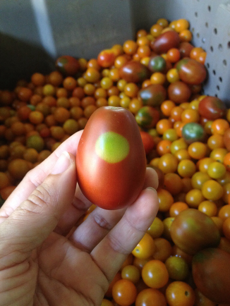 Here at the ARTfarm we tell new employees to try not to name the cute tomatoes, because then we get too attached to them and we wouldn’t be able to eat them. But this one — really. His name is “Spot.”