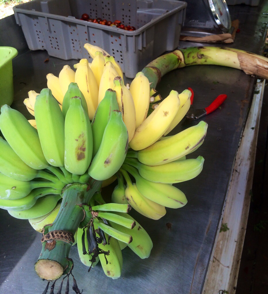 Sweet treats: passionfruit, bananas, fresh Mediterranean figs, fresh-cut zinnia flowers, artisanal bread from Tess, fresh local eggs from Marti Gotts’ chickens, and raw local honey!
