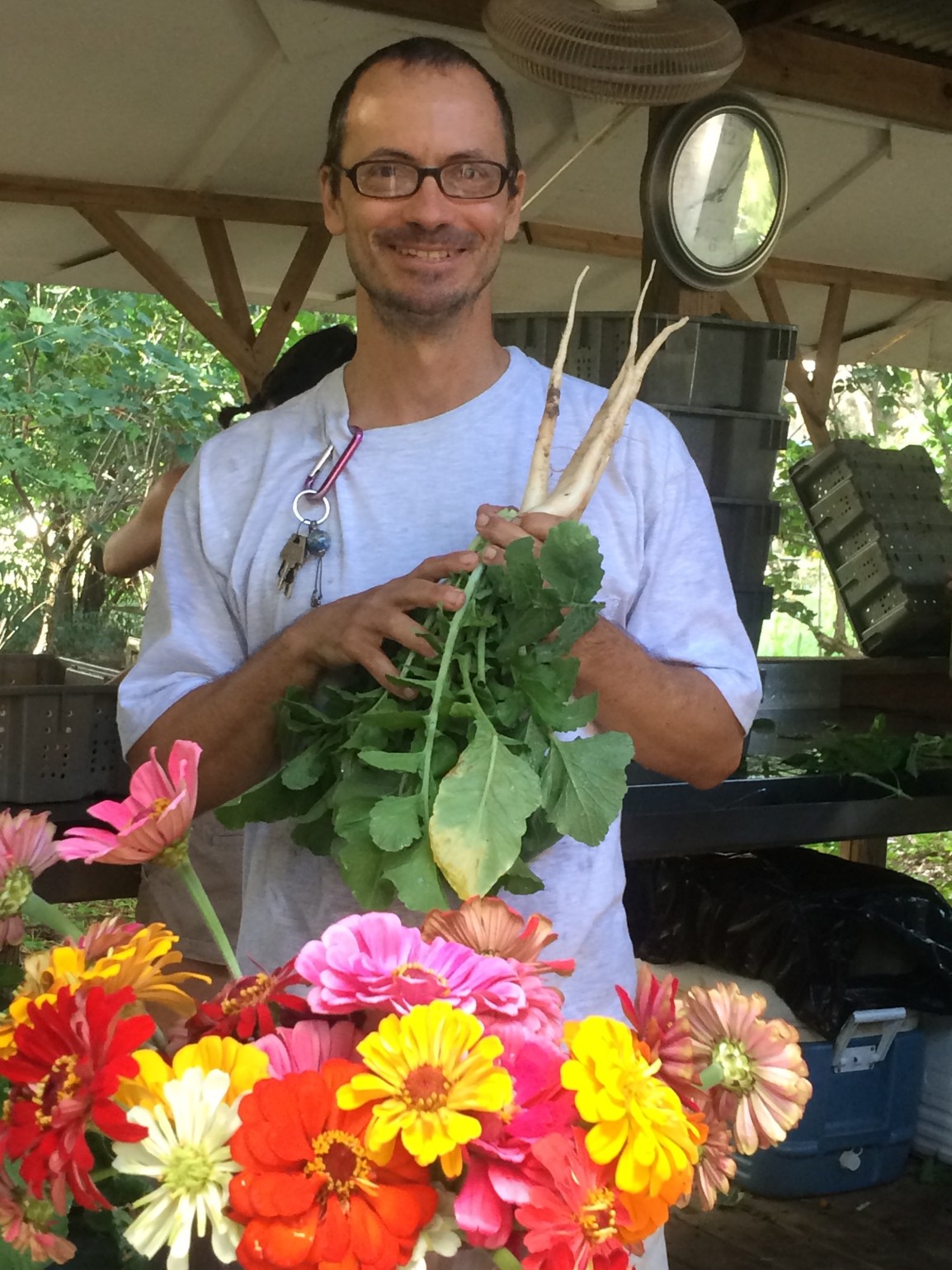 Three types of kale, cherry tomatoes, red slicing tomatoes, slicing cucumbers and wild gherkins, yellow and green summer squash and zucchini, carrots, daikon radishes and the last of the sweet corn for a few weeks;