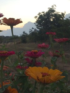BOATLOADS OF: sweet salad mix, cherry tomatoes, slicing tomatoes, green bell peppers, red serranos, Indian chili peppers, Italian basil, fresh-cut zinnia flowers!