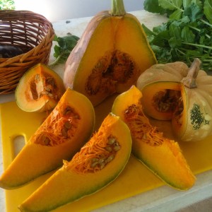 Today’s harvest: Sweet salad mix, baby arugula, baby spicy salad mix, teen arugula, teen spicy salad mix, loads of heirloom tomatoes, slicing tomatoes, loads of cherry tomatoes, a few cucumbers, a few summer squash, green bell peppers, yellow seasoning peppers, red mild serrano peppers, red Indian chilies, Italian basil, Thai basil, lemon basil, holy basil, parsley, garlic chives, assorted pumpkins whole or by the slice, radishes, onions, zinnia flowers, fresh Mediterranean figs, and a few passionfruit.