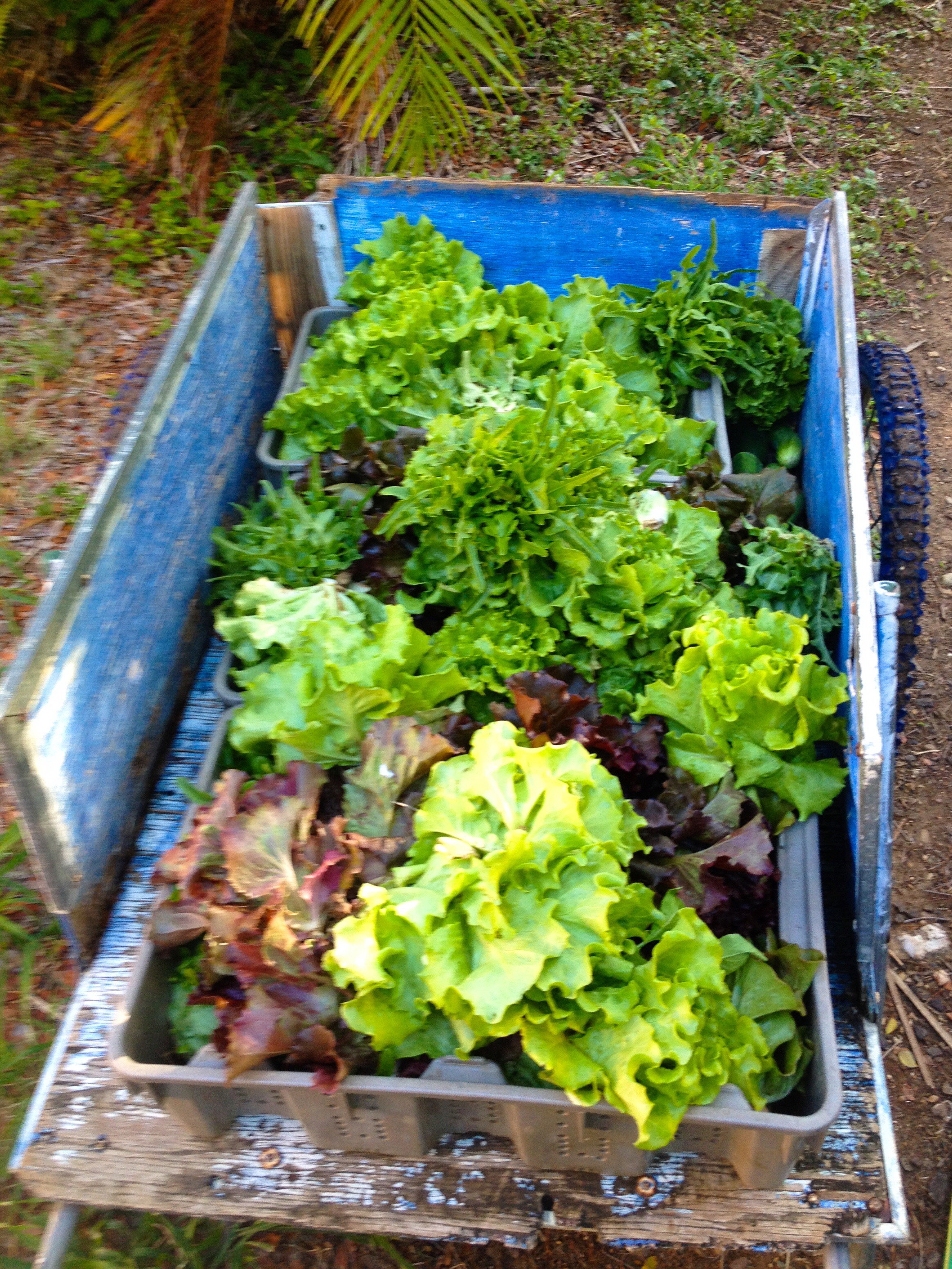 Sweet salad mix, baby arugula, baby spicy salad mix, teen arugula, lettuce heads, sweet potatoes, bell peppers, a few cucumbers, loads of tomatoes all types (slicers, large heirlooms, large cherry tomatoes) abundant. Beautiful onions, cilantro, Italian basil, lemon basil, holy basil, Thai basil, parsley, a few bunches of cooking greens, red serrano peppers, red Indian chilies, yellow seasoning peppers, pumpkin, fresh figs, zinnias, passion fruit and from our partners we have Fiddlewood Farm goat cheese and I-Sha vegan ice cream!