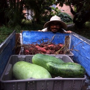 It has definitely been raining around here for what feels like months. The salad greens are loving it as are many other crops. Come out, come out for the following wonderful treats: Sweet salad mix, baby arugula, baby spicy salad mix, sweet potatoes, cucumbers, onions, radishes, Ethiopian kale, dandelion greens, escarole, kale, recao, garlic chives, Italian basil, lemon basil, Thai basil, holy basil, rosemary, lemongrass, a few bunches of cilantro, papaya, and loads of watermelon.
