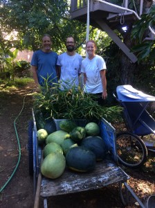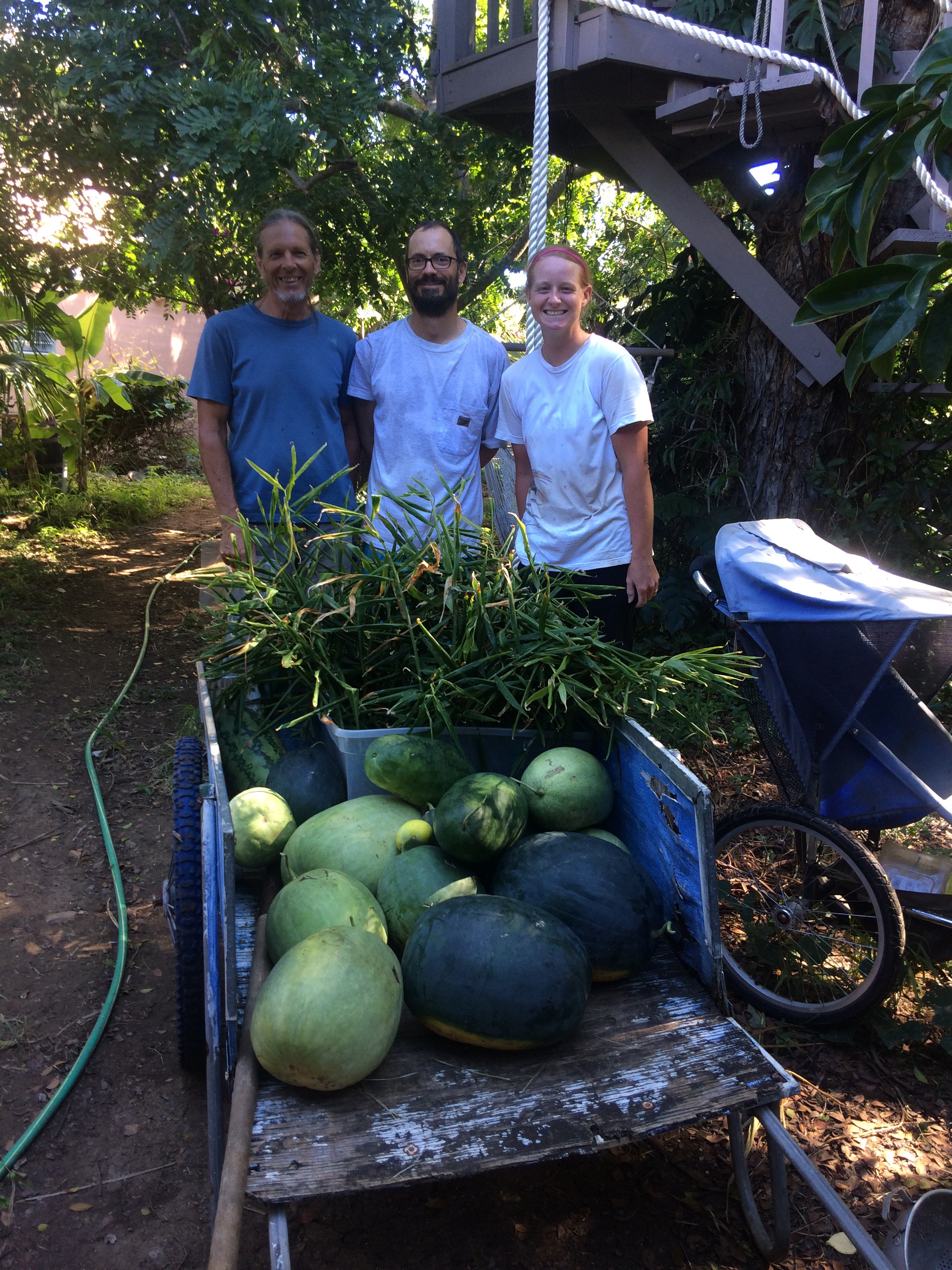 Cartloads of beautiful watermelons of all types, a few sweet papayas, carrots, tender baby ginger, cucumbers, cherry tomatoes, a few slicing and heirloom tomatoes, cooking greens including different types of kale and collard greens, escarole, dandelion greens, radishes, onions, scallions, garlic chives, cilantro, parsley, recao, dill, Italian basil, lemon basil, Thai basil, holy basil, green Serrano peppers, green hot Indian chilies, a few sweet bell peppers, and cut flowers: zinnias and sunflowers!