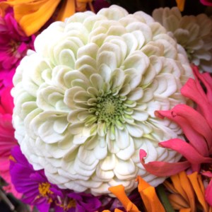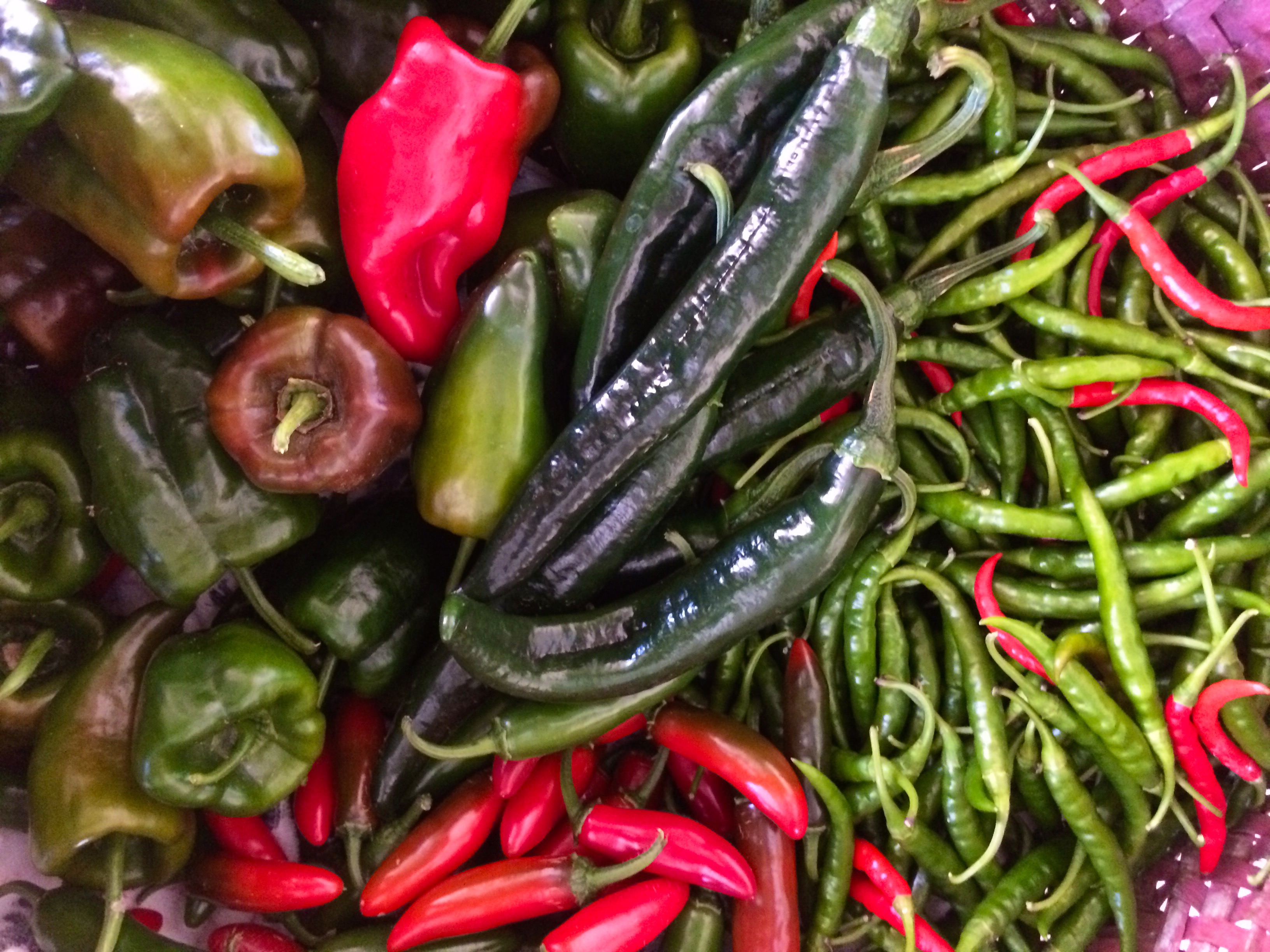 peppers in all colors, shapes, sizes and temperatures – yellow seasoning peppers, Indian chilies, serranos, ancho peppers, pasilla bajia; a few fat Mediterranean figs, and lots of zinnia flowers!