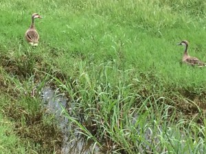 A pair of whitecheeked pintails apparently mistook a large puddle near the toolshed for a body of water. Who could blame them? We’ve gotten over 9 inches of rain in the last fortnight.Some of our helpers who came in early today told us that there is still some roadside flooding this morning after last night’s rain (we measured slightly over 2 inches here at Longford). Please take your time on the roadways, but rest assured we are open with lots and lots of great produce today! Looking forward to seeing you all!