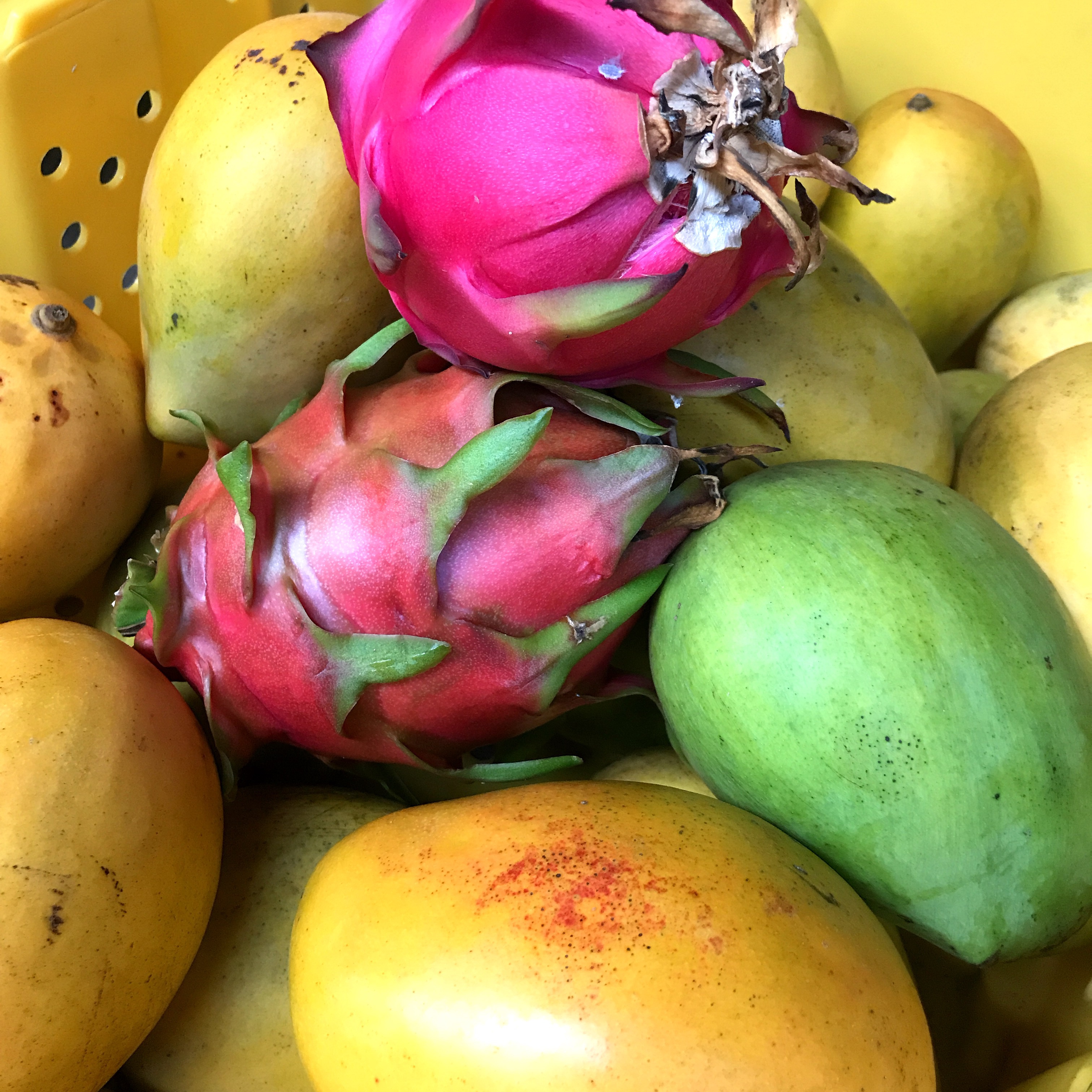This morning 10am – 12 noon at the ARTfarm we have fruits galore. Pineapples, tubs upon tubs of papaya, tons of dragonfruit of many varieties (light pink, pink, dark red, and purple fleshed), and mangoes in assorted varieties: