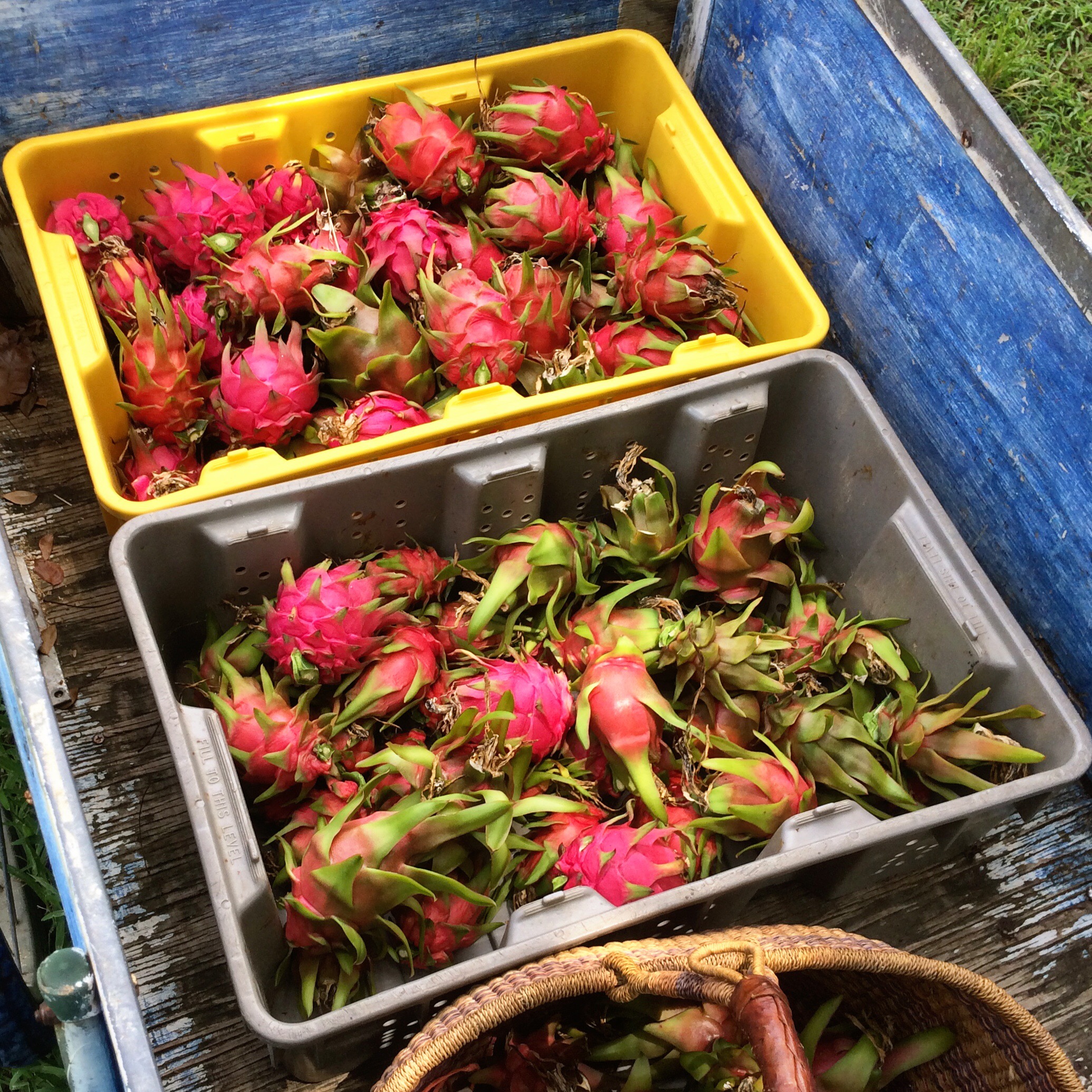 Saturday we will have loads and loads of dragonfruit in five different colors: dark red, purple, pink, light pink, and white. Also lots of sweet potatoes in all sizes, sliced pumpkin, sweet potato greens, bunched arugula, Italian basil, garlic chives, recao, rosemary, lemongrass, passionfruit, lots and lots of papaya, and lots of native trees, and pineapple slips!