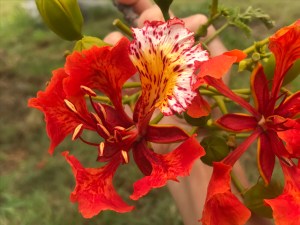 Flamboyant trees are blooming on the farm.Summer is gliding along. Here’s the afternoon farmstand lineup: Lots of sweet potatoes, sweet potato greens, garlic chives, rosemary, lemongrass, papaya, dragonfruit. And avocados from Tita!