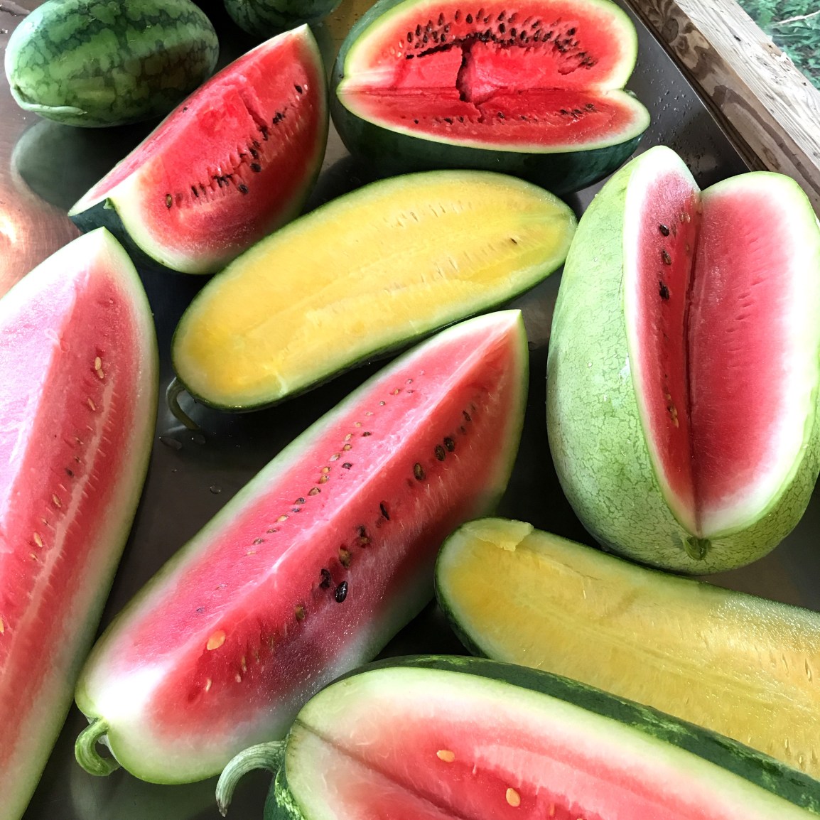 Saturday parade day farmstand: lots of beautiful sweet salad mix, arugula, baby spicy salad mix that’s almost micro, plenty plenty tomatoes, lots of cherry tomatoes, lots and lots and lots of watermelon, lots of fresh Mediterranean figs, Thai pumpkin which is Luca’s favorite, lots of butternut squashes, lettuce heads, baby bok choy, cooking greens, Japanese chrysanthemum melons, Italian basil, Thai basil, lemon basil, holy basil, cilantro, dill, garlic chives, loads of baby ginger, baby turmeric, Serrano peppers, super hot -n- tiny Thai peppers, a few bell peppers, papayas, and loads of beautiful zinnias.