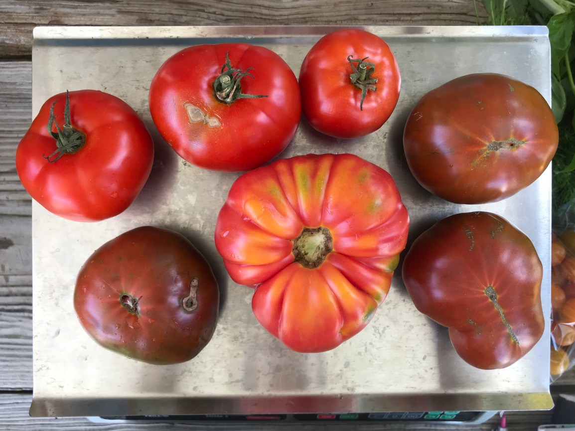 A customer’s selection of our heirloom and slicer tomatoes was so lovely we had to snap a picture right on the scale!