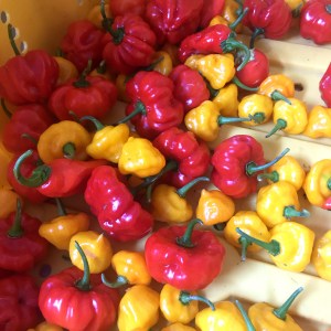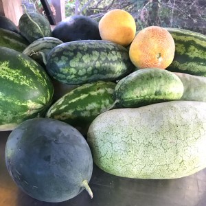 We have: loads of fresh sweet salad mix, teen arugula and teen spicy salad mix in the cooler, romaine-lettuce-like heads, watermelon, scallions, the first of our onions, baby French radishes, carrots, hopefully a few bunches of beets, plenty of fresh herbs including dill, cilantro, parsley, Italian basil, lemon basil, Thai basil, garlic chives, beautiful baby ginger and baby turmeric, sweet papaya, all of our small peppers both hot and sweet including beautiful seasoning peppers, a few heads of broccoli, cooking greens, dandelion greens, a little bit of escarole, Thai pumpkin, butternut, Guatemala blue winter squash, and zinnia flowers. Earlybirds will get their pick of the limited supply of figs and cucumbers.