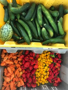 Three types of cucumbers, sweet salad mix, baby arugula, baby spicy, lots of heirloom tomatoes, cherry tomatoes, slicing tomatoes, Thai pumpkin chunks, sweet potatoes, baby bok choy, carrots, baby ginger, all of our assorted peppers (hot and seasoning), papayas, small amounts of broccoli, lots of broccoli leaves, dandelion greens, garlic chives, Italian basil, cilantro, dill, Thai basil, lemon basil, and last but not least, the perfect little treat for these hot days…