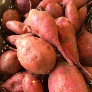 There is superficial damage on the sweet potatoes from potato weevils, a subterranean pest that wiped out our crop last year. You may find a happy little weevil (who loves organically produced food as much as you do) as you clean and chop these potatoes. This will be the last crop of sweet potatoes from us for a couple of years. Rather than spray harmful pesticides, we will stop supplying the bugs their favorite food and wait for the weevil population to give up; and then we will replant this delicious crop.
