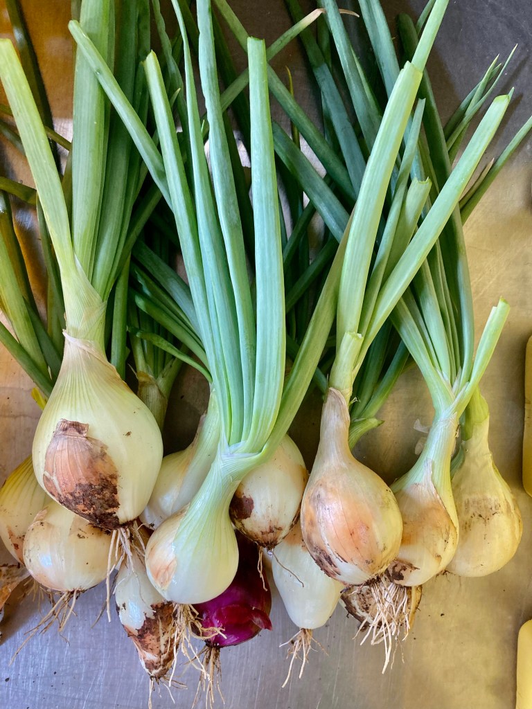 Bunched sweet onions with green tops $5