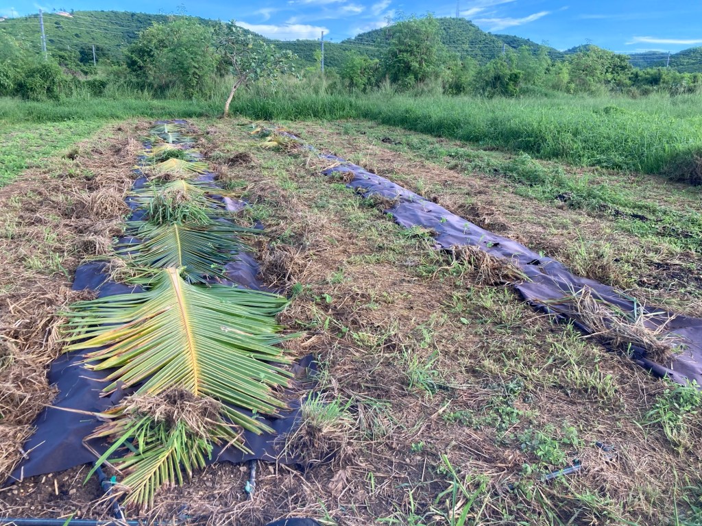 The great news is that we have more stored rainwater than we’ve ever had at this point in the season. Our ginger, turmeric, yams, established fruit trees and coconuts are looking great. We are also experimenting with cover crops planted near our food crops, and those beds are performing better in these overly wet conditions. Farmer Luca is experimenting with organic biodegradable paper mulch on our watermelon beds, with pretty good results so far.
