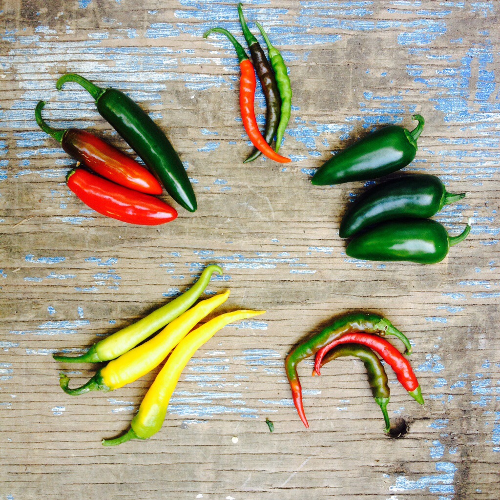- Green (mild) and red chili peppers (hottest) and green jalapeños (mild)