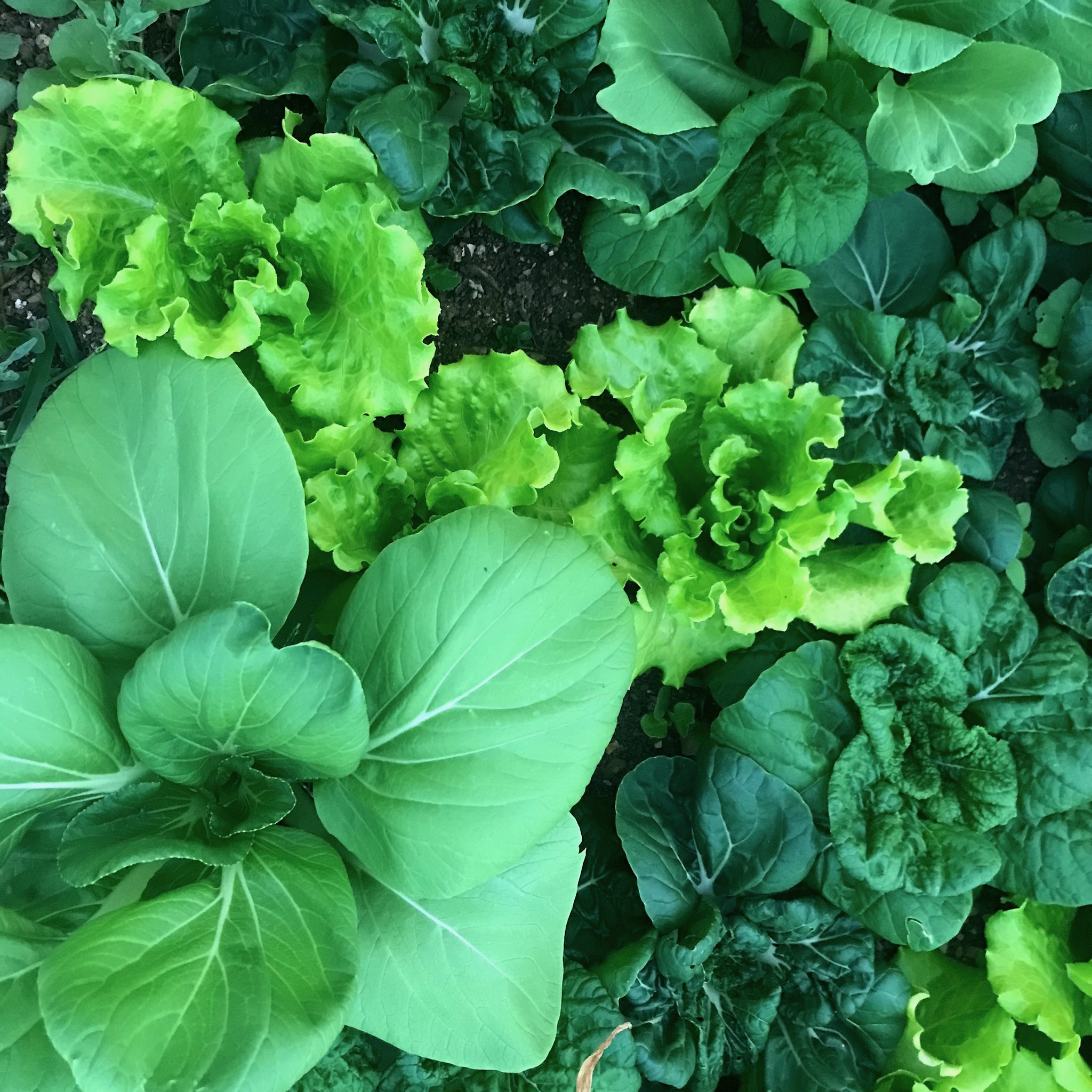 A rainbow of greens on rich topsoil. Get your healthy on with lettuce, Chinese cabbages, radishes, turnips, arugula and more!