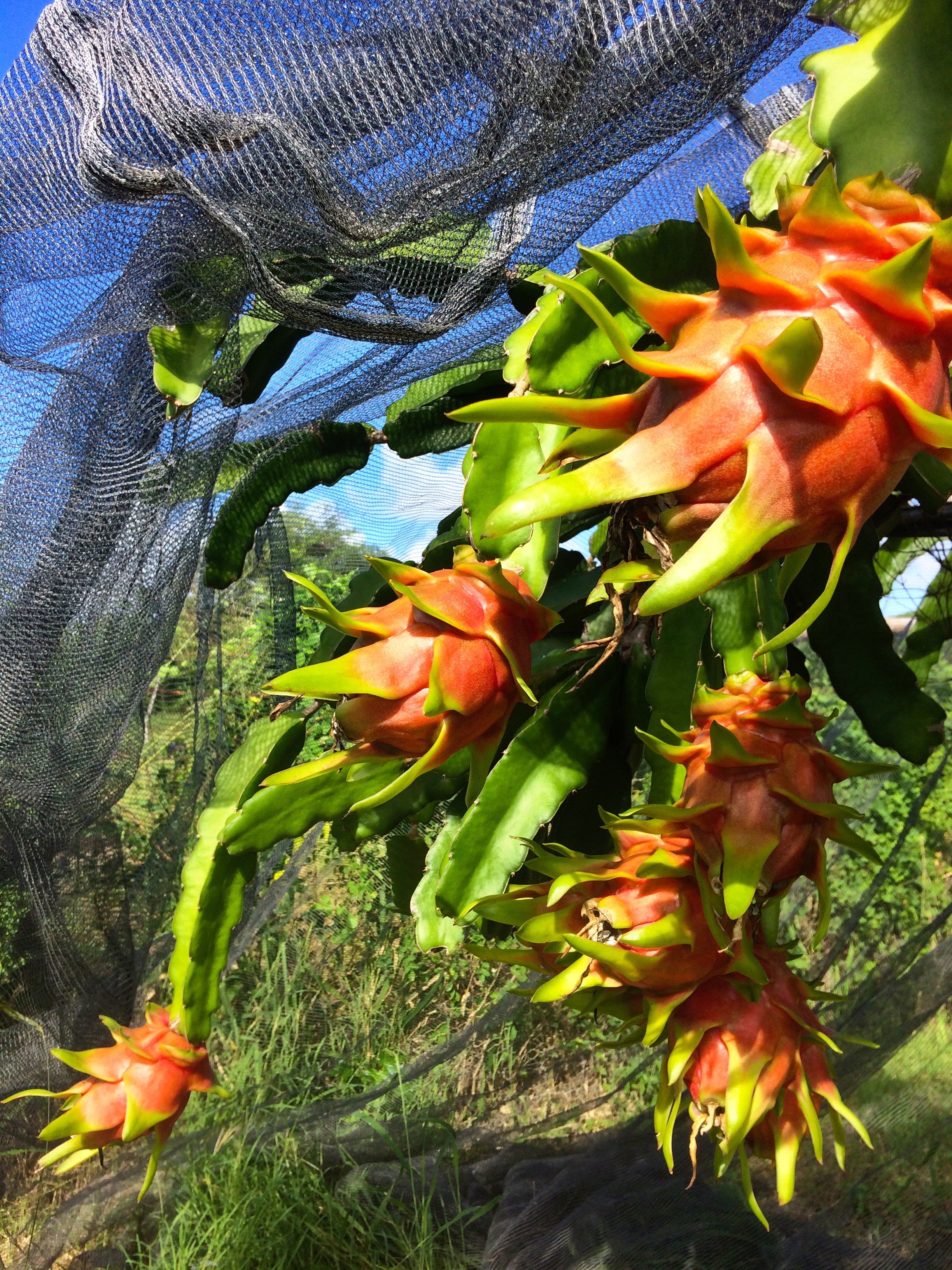 We sell delicious ripe sweet dragonfruits (also called pitayas) at ARTfarm, but we also occasionally make cuttings available so you can try your hand at dragon farming. These domesticated cousins of the wild night-blooming cerreus are relatively easy plants to grow in the subtropical climate of the Caribbean, and can tolerate full sun or partial shade. Dragonfruit is a climbing cactus vine of spiky green triangular sausages whose care leads to some odd bedtime habits: certain varieties need to be hand pollinated, and the blooms only open at night. This article will get you started, and then you’ll want to search the web for more details. Welcome to our obsession: