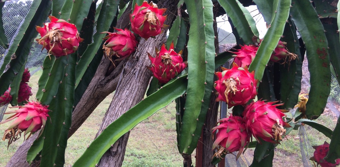 ARTfarm Wednesday’s farmstand is full of dragons dragons dragons, but they’re friendly. Are you a Seeker of organically grown produce? Last night’s extreme thunderstorm from the North blew in lots and lots of nitrogen, instantly ripening baskets full of adorable dragonfruit, plus loads of sweet sweet potatoes in all sizes, lots of Prefect Percy papaya, plentiful passionfruit, mysterious sweet potato greens, Malvoy (Malabar) spinach, wild pasture gherkins, garlicky garlic chives, Italian Basil fresh from the Quidditch field, recao, rosemary, lemongrass wands, bunched arugula, a few sleepy soursops, giant orange pumpkin slices delightful for making refreshing pumpkin juice or delicious pumpkin pastries (perfect for train travel), and of course lots of native trees that would love to be planted out into a Forbidden Forest in these moist conditions.