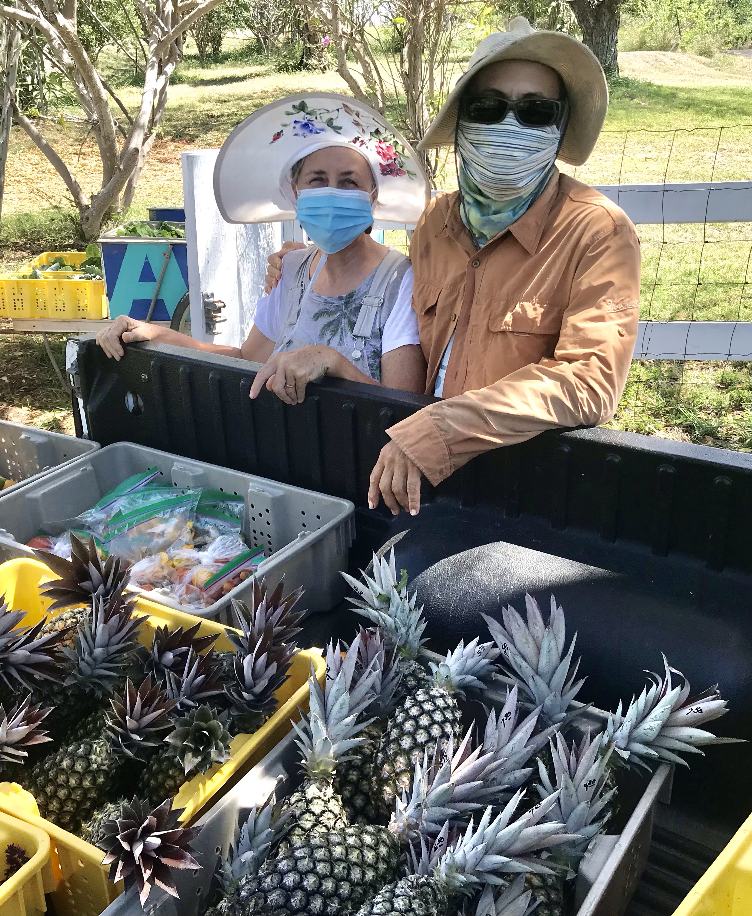 Pineapples are starting, gorgeous salad greens, onions with green tops, papayas. It’s true, we’ve harvested and sampled the very first pineapple of the season, we’ll have some for early birds as an extra at pickup! To celebrate Earthday, our littlest farmer moved her hens into their new digs this week and they should start laying beautiful eggs in the next few weeks! Thanks to Spencer Fulkerson for welding up the frame to withstand tropical weather! We are also continuing progress with our WCK grant project. We’ve been saying it for a while, but seriously folks we’ll be winding down the big distributions in May for the summer (unless the weather shifts dramatically) and shift to pop-up stands for any remaining bursts of produce. Wednesday distributions are curtailed for now.