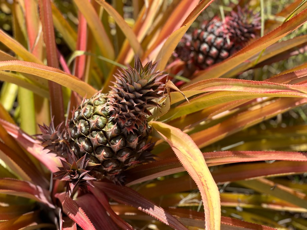 As the weather gets hotter and drier on the South Shore of St. Croix and the tomatoes succumb to the drought, ARTfarm pineapple fruits start to increase in size. Watch for hummingbirds who feed on the flowers of young pineapples!