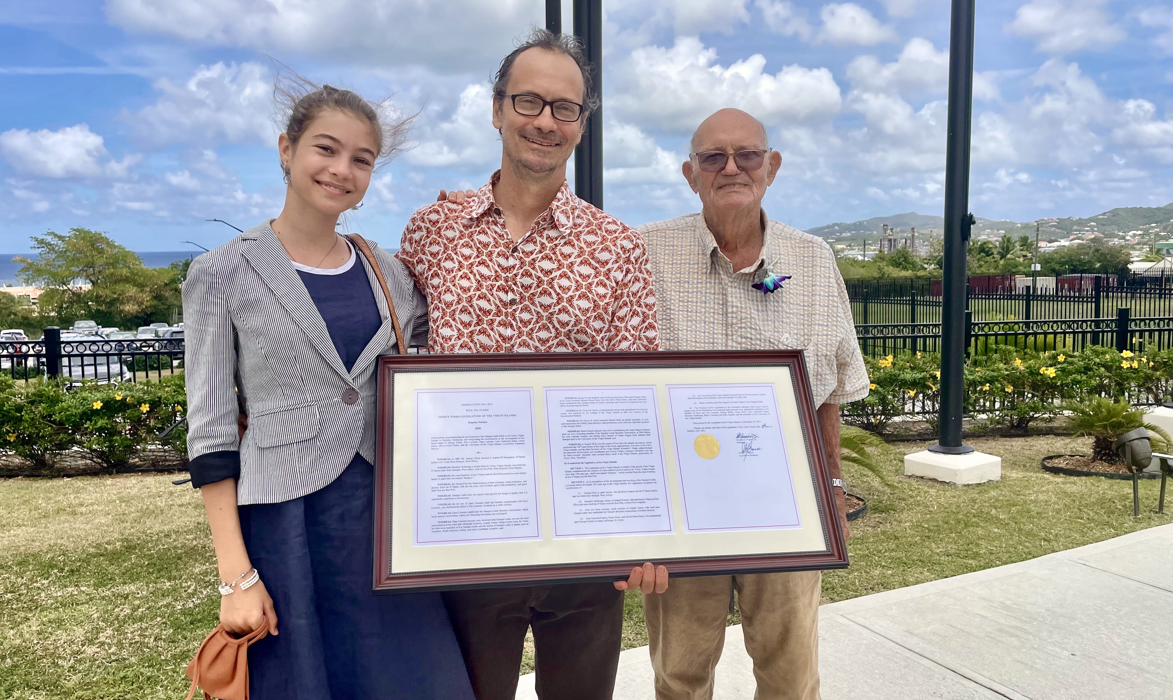 Three generations of Gasperi farmers on St. Croix! On Monday, April 4, 2022 Luca’s dad Kiko was honored by the 33rd legislature of the US Virgin Islands with a Perma-Plaque for his lifetime contributions to the development of the Senepol cattle breed, a beef breed that originated on Saint Croix USVI in the early 1900s. Senepol cattle are known for their excellent performance when pastured under brittle, droughtlike conditions and scrub forage, and the breed is now a significant addition to sustainable beef production across the US Sun Belt and South America. Kiko Gasperi came to St. Croix from Italy in the late 1960s to work at Castle Nugent with his brother Dr. Mario Gasperi, and served as the ranch manager for Castle Nugent Farms under his sister-in-law Caroline and her son Mauro after Mario’s passing in 1989. Kiko spent many years building and mending fencing, tagging calves, dipping herds, and managing pasture. In the hotter part of the day for thirty years he’d be found in his office poring over breeding records and selecting the best animals based on performance to improve the Senepol breed. Our thanks to Senator Myron Jackson who pushed for this resolution to honor the elders who were involved in this work.