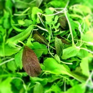 - 1 bag of teen arugula or spicy mix (mesclun-ish: arugula, mustard greens, radish greens etc.)