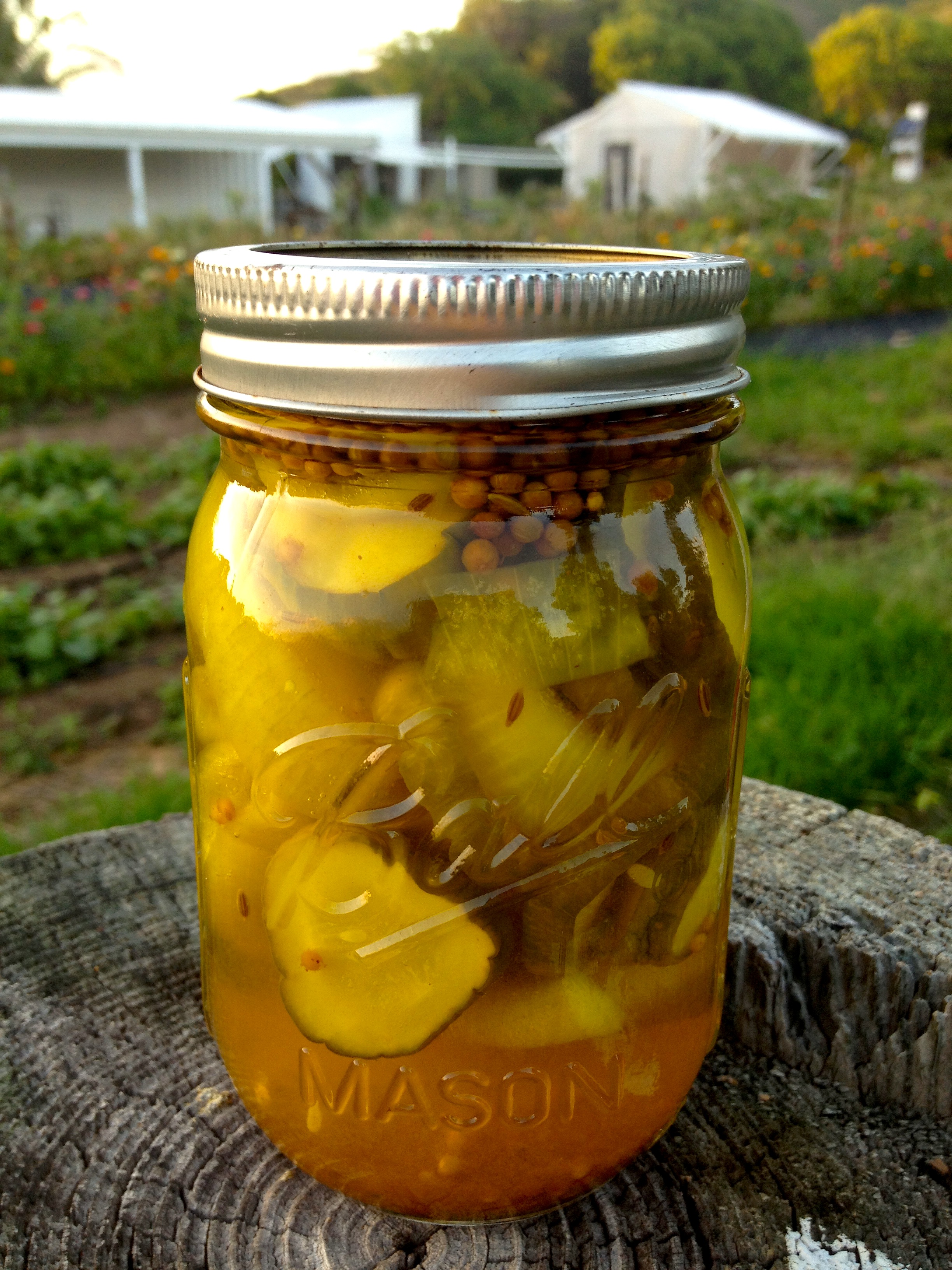 A jar of freshly pickled cucumbers sitting on a fence post gleams in the late day sun, with colorful zinnias, green garden beds and the ARTfarm seedling house and farmstand in the background.
