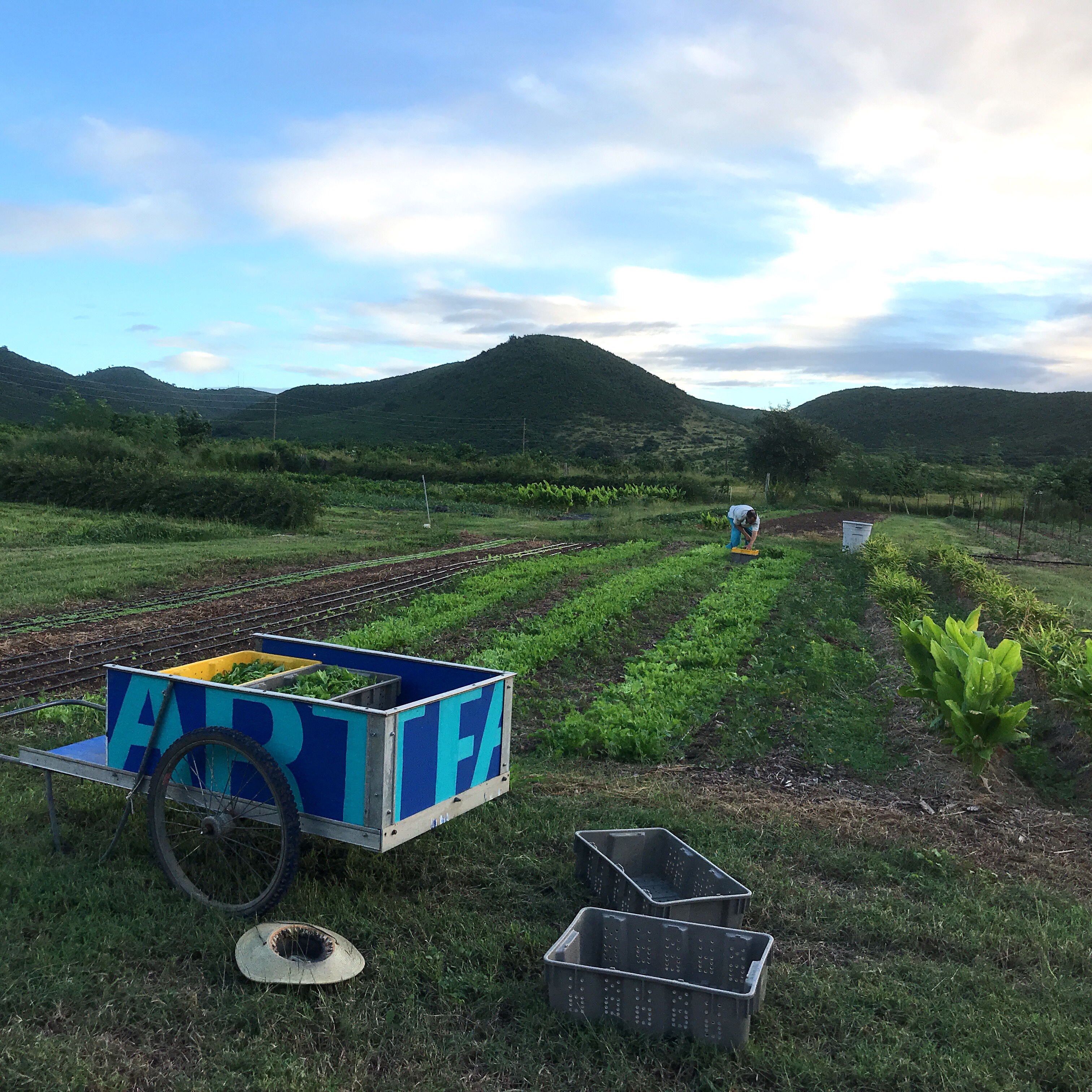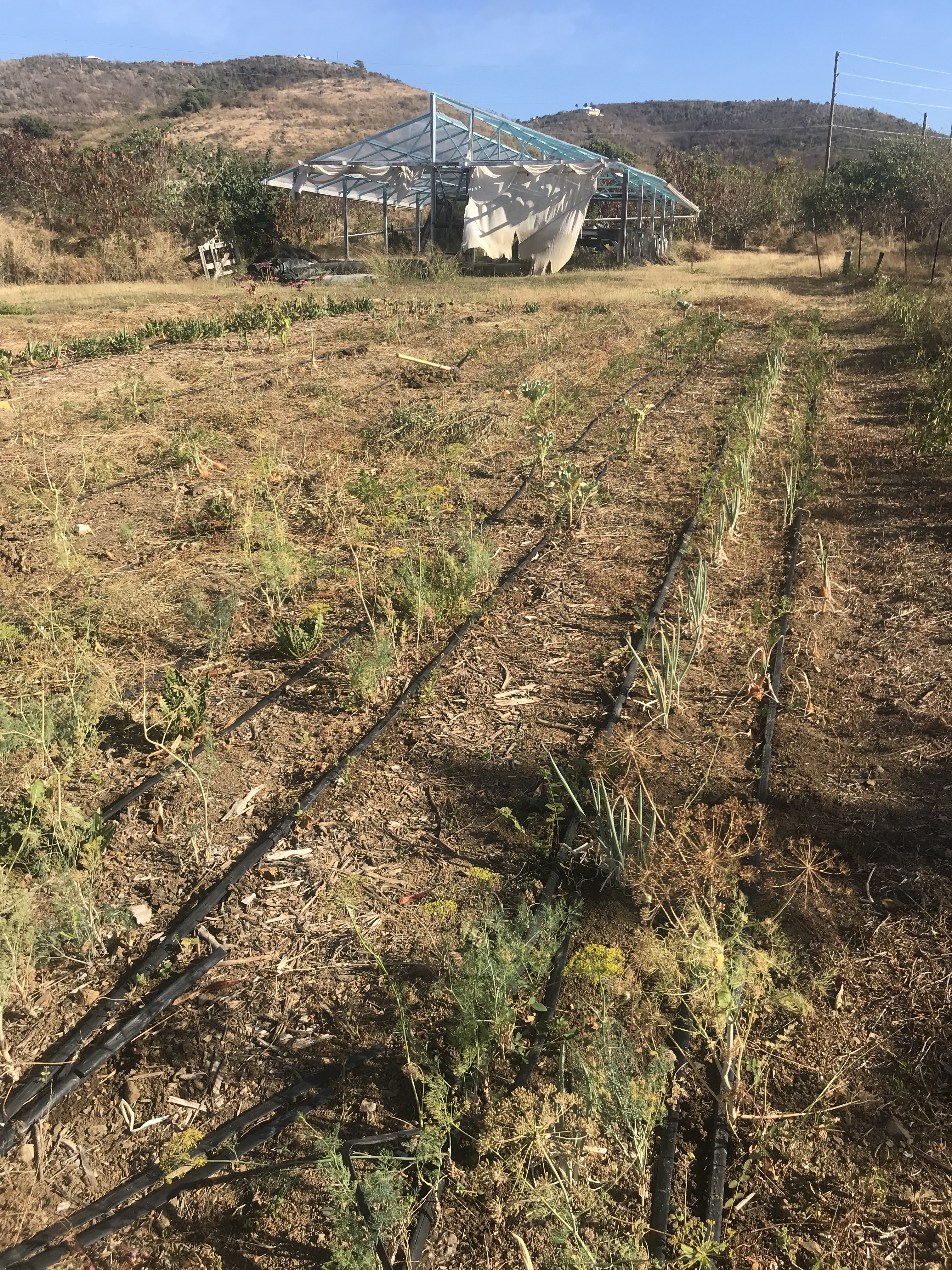 In stark contrast to the usual photos we post of the farm, here is the current reality. In the background, the ARTfarm greenhouse still needs repair from damages incurred in Hurricane Maria.