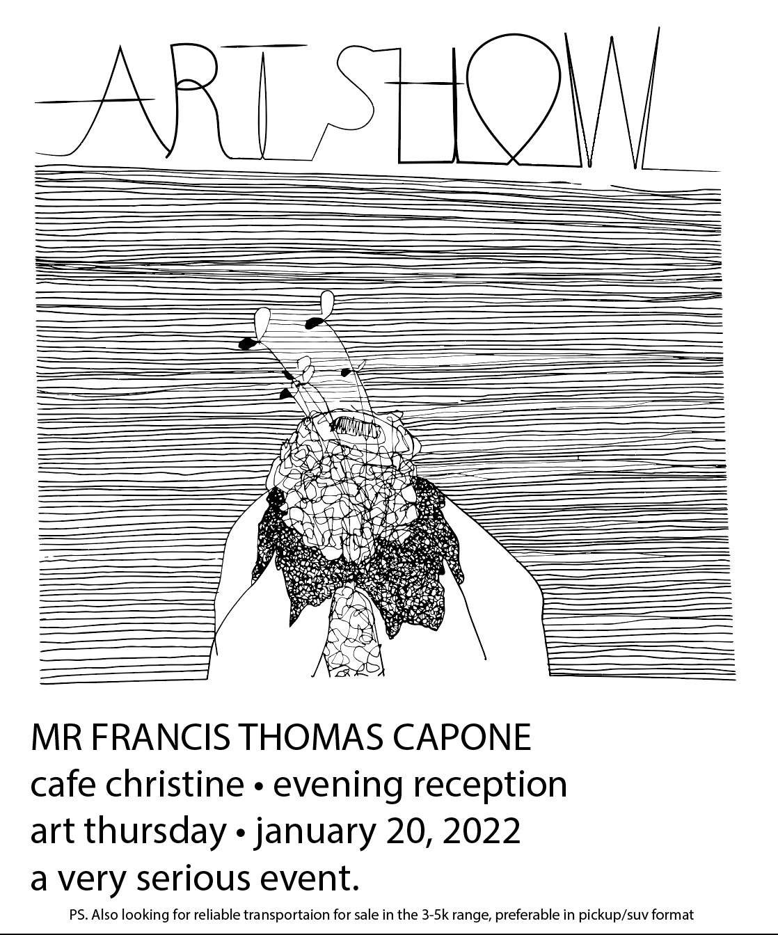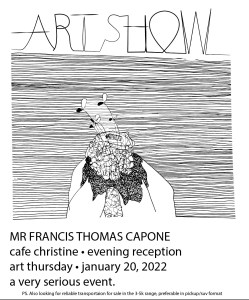 Our amazing friend-of-the-farm Francis Capone opened his art exhibit at Café Christine last night! Stop by the Café over the next month or two and check out his beautiful drawings and relax with some coloring. Crayons provided! Enjoy amazing lunches with lots of ARTfarm produce by Chef Lisa at Café Christine! Outdoor seating, 11:30am-2:30pm Tuesday-Friday