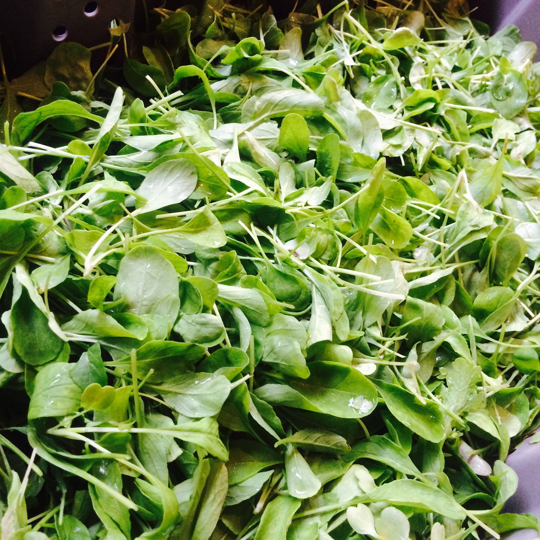 Small but very fresh quantities of: mint, chives, recao, thyme, radishes, zinnias, passionfruit, kafir limes, baby arugula, baby spicy salad mix, sweet potato greens and young cucumbers.