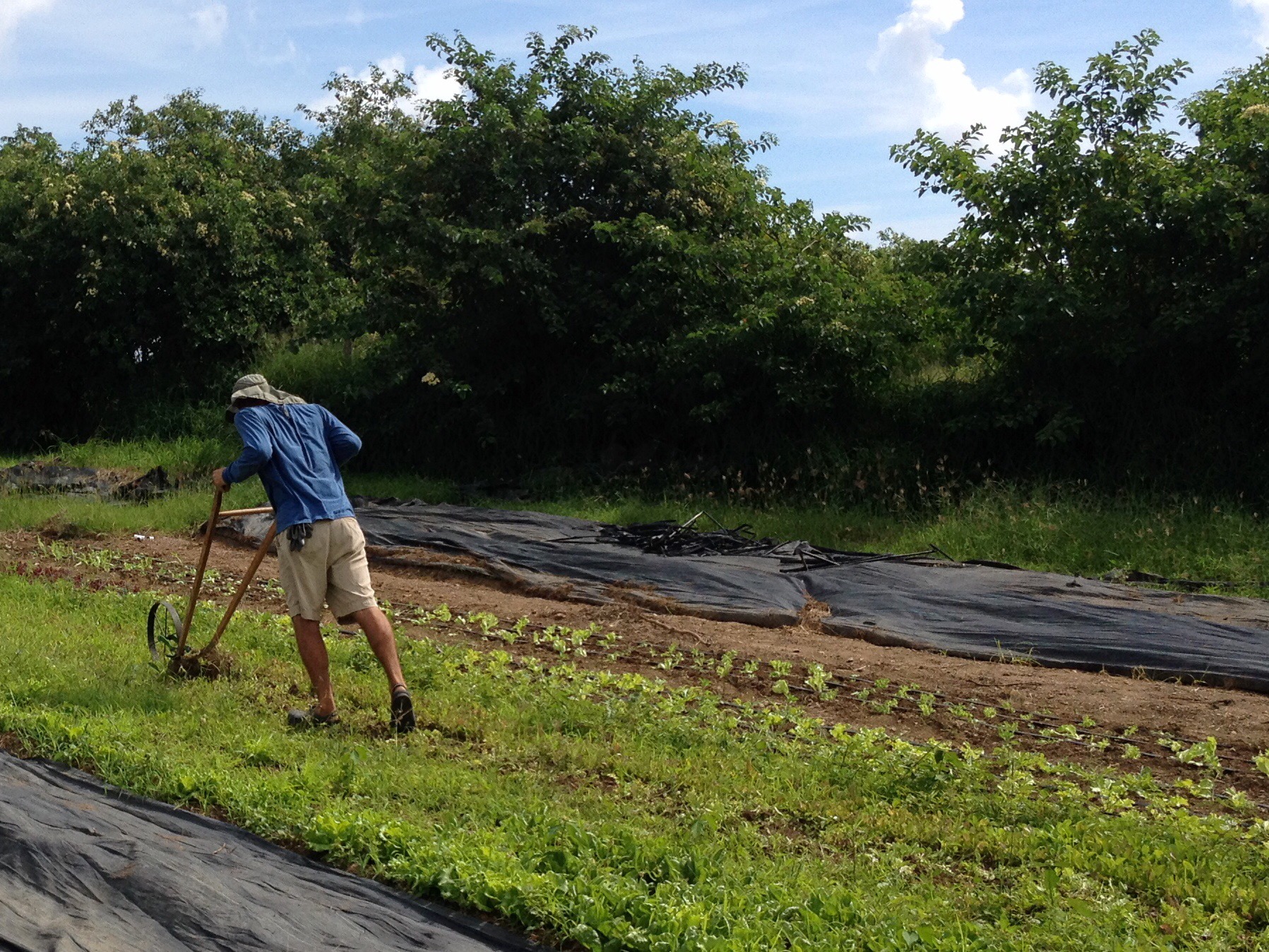Matthew loves cultivating with our wheel hoe. No fossil fuels required!