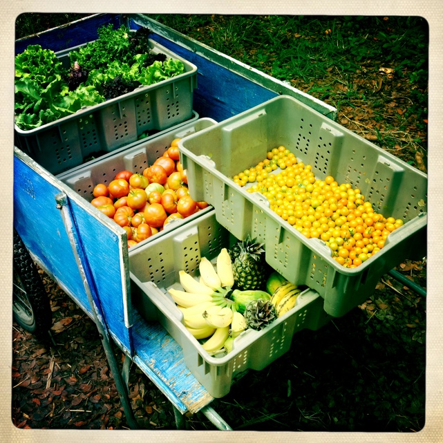Kale, collards, baby bok choi, chinese cabbage; baby spicy mix, baby arugula, teen arugula, regular arugula, spicy mix, sweet mix, lettuce heads; italian and holy basils, lemongrass, garlic chives; papaya, local honey, and homemade Sweetface chocolates! Come dance in puddles with us!