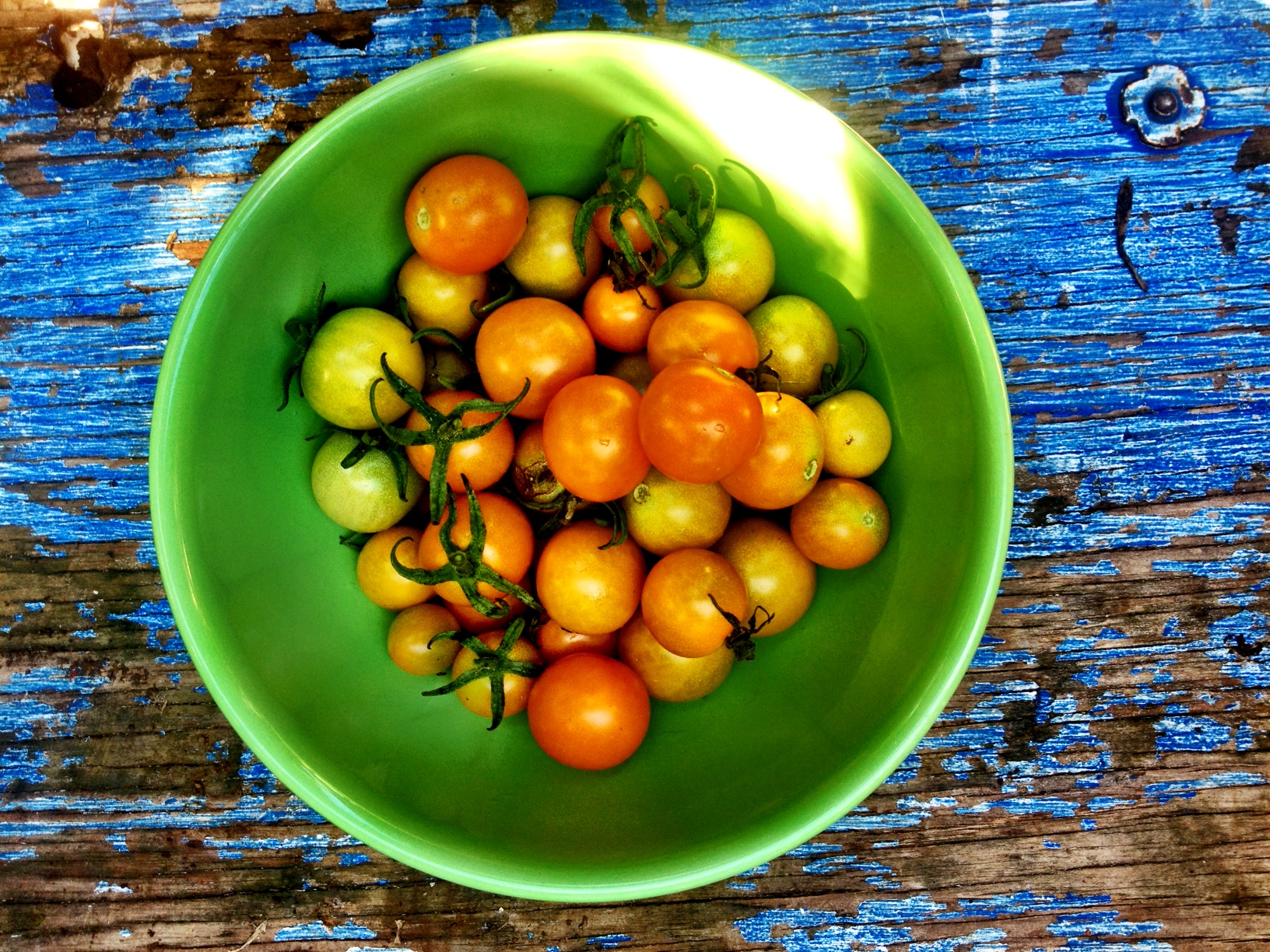 A green ceramic bowl holds a generous handful of vine-ripe cherry tomatoes in yellows and oranges, sitting on a worn wooden board with blue fading paint.