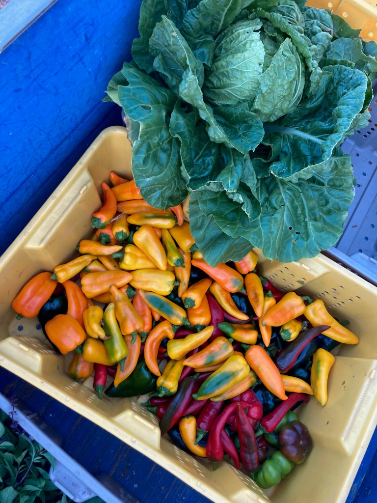 Come early for first dibs on WATERMELON, baby arugula, heirloom, slicer and cherry tomatoes, fennel, pumpkin slices and whole winter squashes, peppers, onions with juicy green tops, chinese cabbage, bok choy, ginger and turmeric, radishes and turnips with edible leafy tops, assorted fresh herbs (but sadly, still no Italian or lemon basil today – but Thai basil available). Feel the WINTER WINDS!!